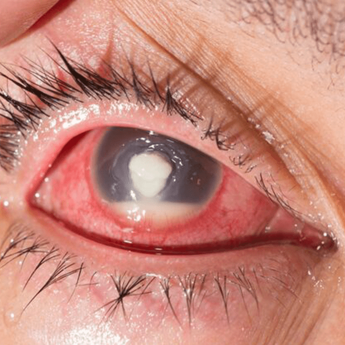 As causas mais comuns são os traumas oculares, exposição da córnea por retração palpebral, mal posicionamento dos cílios (entrópio – os cílios voltados para dentro do olho ulcerando a córnea) e o uso indevido de lentes de contato. O uso equivocado de colírio anestésico, mesmo com todos alertas já feitos pelos oftalmologistas, também pode levar à ulceração e necrose da córnea com perda do globo ocular.