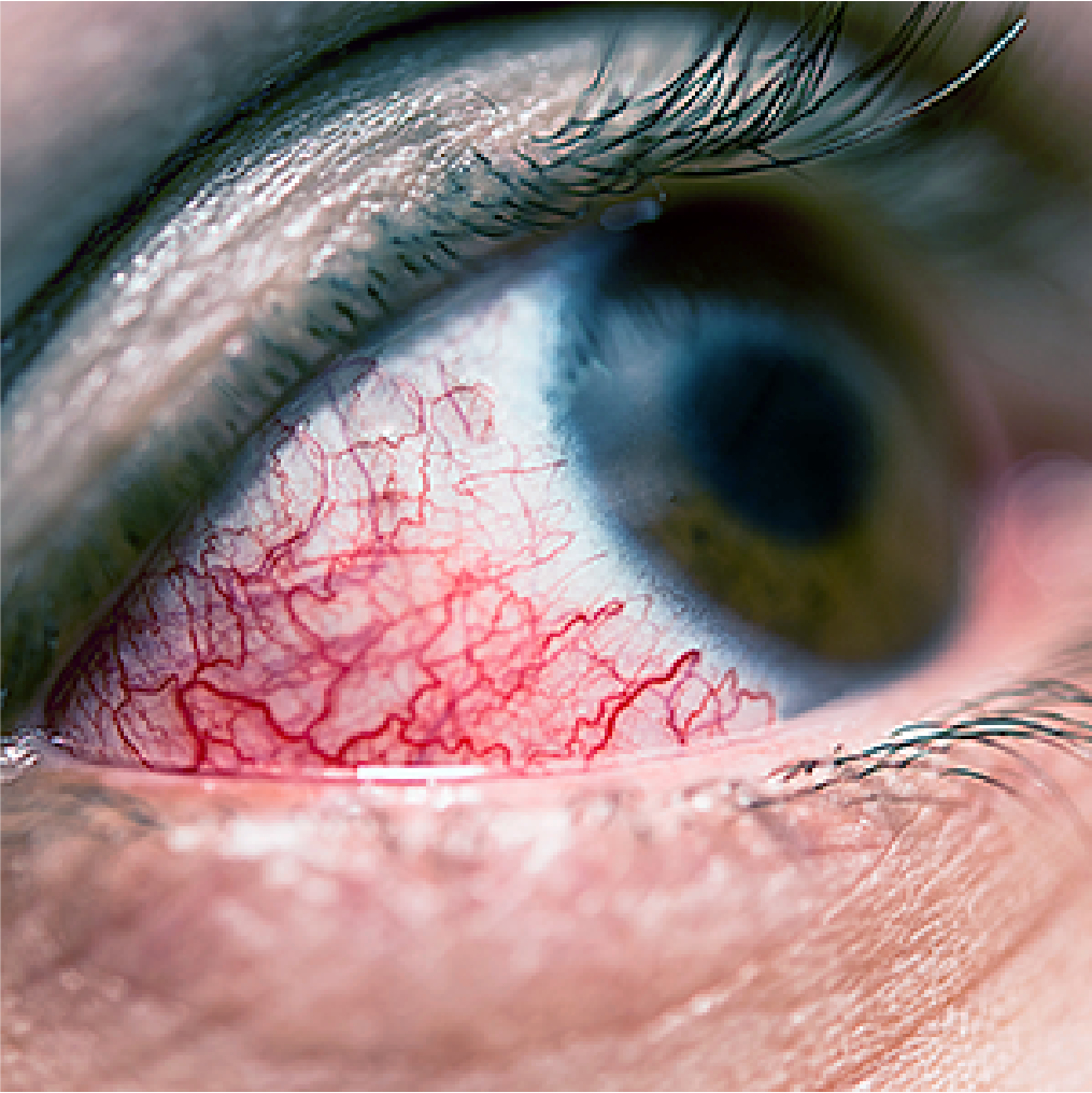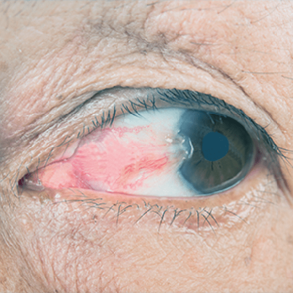 O pterígio é um espessamento vascularizado da conjuntiva de forma triangular que se estende do ângulo interno (nasal) do olho em direção à córnea. Não é infeccioso, mas pode afetar a visão. Pode ser tratado por meio convencional ou por cirurgia de remoção.