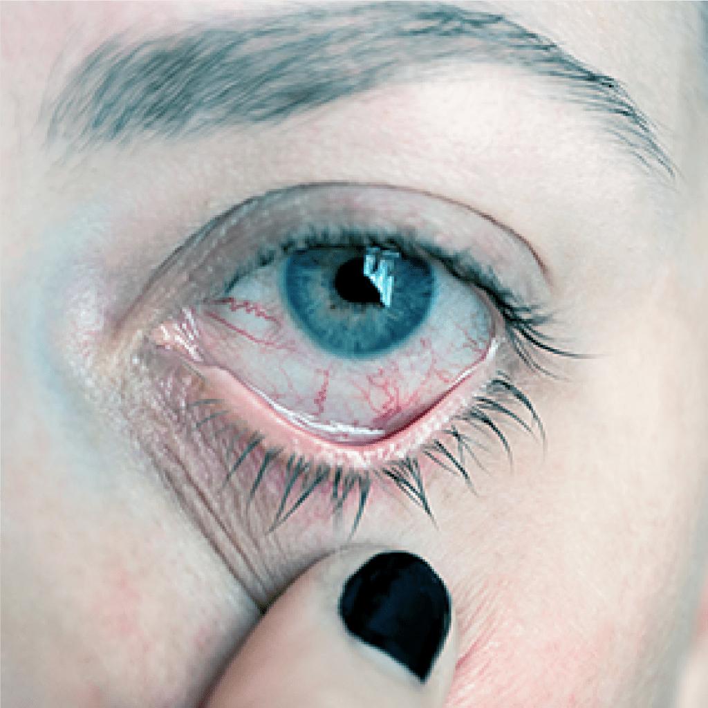 Ardência, irritação, sensação de areia nos olhos, dificuldade para ficar em lugares com ar-condicionado ou em frente do computador, e olhos embaçados ao final do dia.